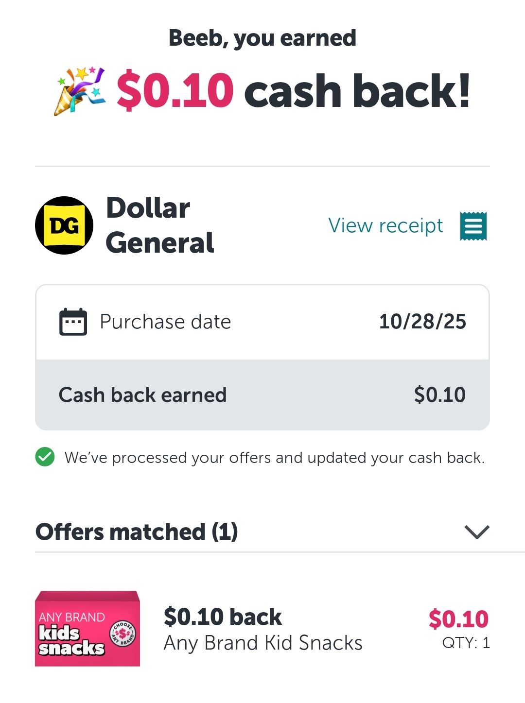 Ibotta is a rebate app that I use frequently, and I have my Ibotta account linked with my DG rewards account, so they are synced up with my digital receipt history. If you should happen to buy something that qualifies for a rebate, but you didn’t clip the offer, Ibotta lets you know and gives you a chance to add these rebates for a window of time after your trip and still claim them, which I love! So after my trip, I got a notification from Ibotta that I had a missed offer on this shopping trip for .10 cents back on “Any Brand Kid Snacks”. It doesn’t tell me which specific item qualifies for this offer, but I presume this is on the jerky, because the only other consumable item – for humans, anyway! – is the 5-Hour Energy shot, which specifically says on the label that it’s not recommended for children; so the jerky is the only item it could be. And because the jerky only cost a penny, that means that it was free plus .09 cents profit! Here’s how to do the deal: