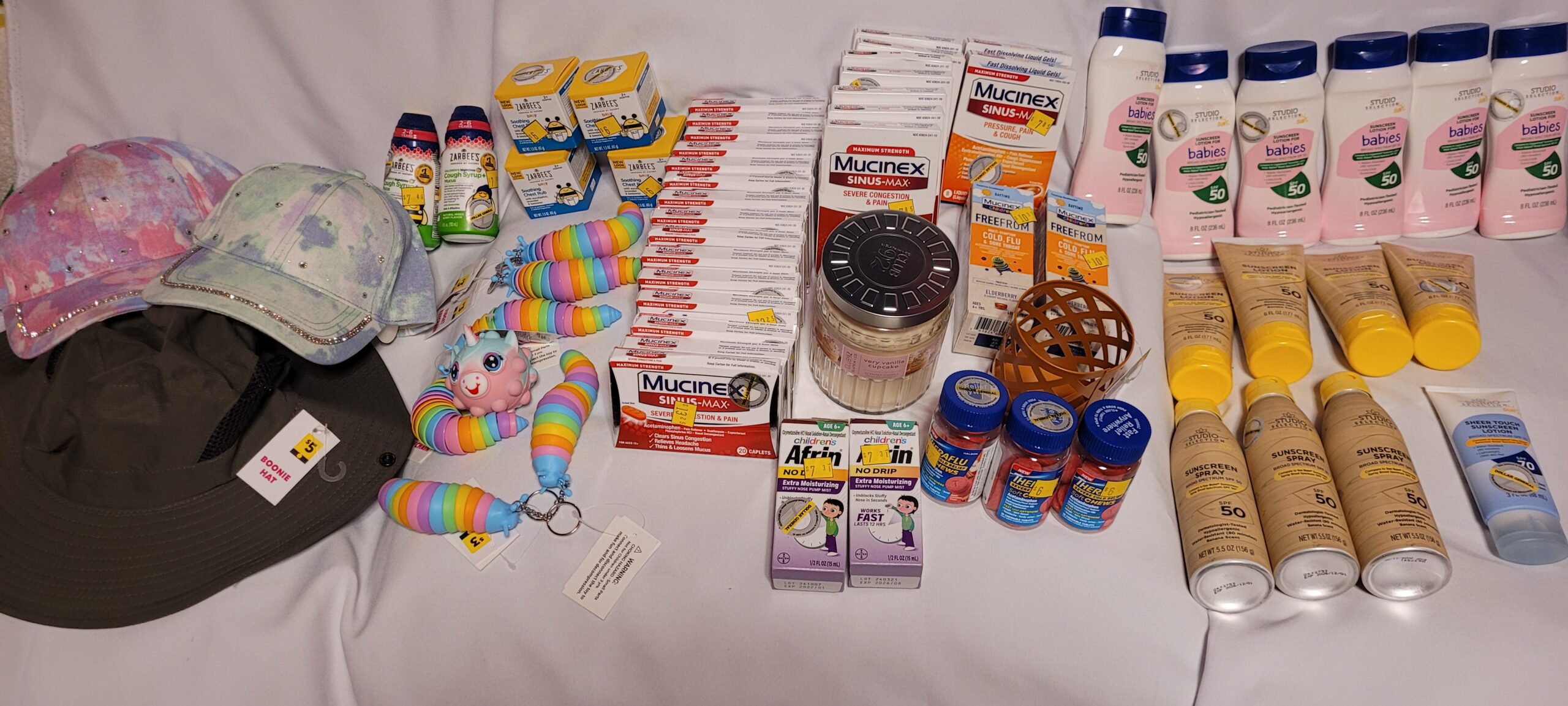 What a great week of shopping this was! I was so excited about all the penny sunscreen, because that’s something I go through a lot of, and it can get pricey! The expiration dates are all well out into 2026 and 2027, so they’re perfect stockpile items – likewise for all the cold & flu products, which are also good until 2027, so my medicine cabinet is now fully stocked! I will be donating the surplus medicine, and donating or gifting most of the little trinkets and toys. I found so many cool and useful items this week which will all be put to good use – in total, this is $900 worth of stuff for less than two bucks!
