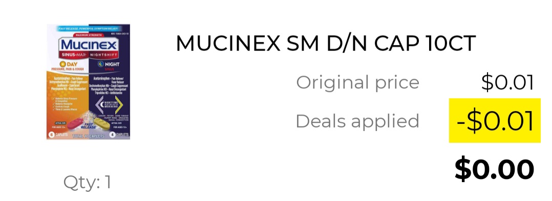 3 boxes of Mucinex Sinus-Max Nightshift, 10ct – originally $7.85 each. One of these boxes was completely free, because I had a Mucinex coupon loaded to my DG account.